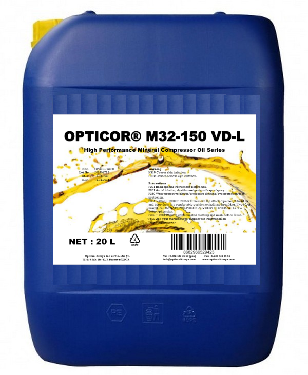 OPTICOR ® AIR COMP M32-150 VD-L serisi ürünlerimiz, orta ve ağır koşullar altında çalışan hem pistonlu hem de rotari kompresörlerin yağlanmasında kullanılmak üzere tasarlanmış, yüksek kalitede rafine edilmiş mineral baz yağlar ve üstün katık teknolojisi kullanılarak üretilen bir kompresör yağıdır.