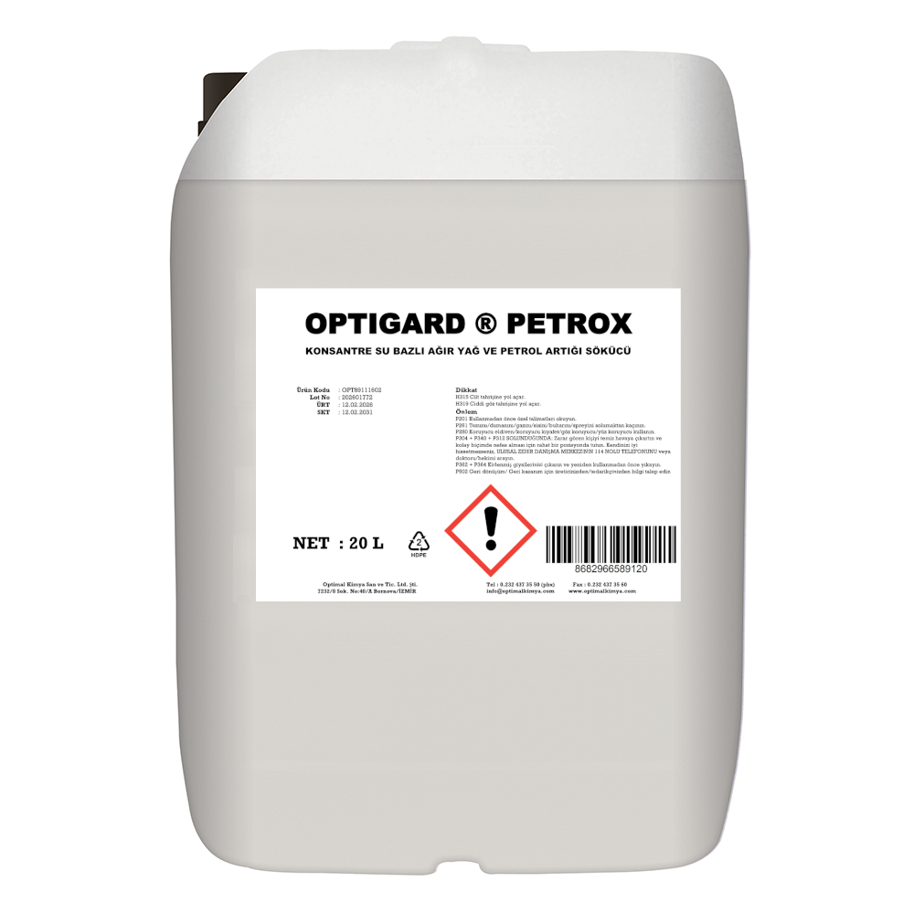 OPTIGARD ® PETROX, su ile temas edebilen her türlü yüzeyde ve metal aksamlarda, çok amaçlı kullanılabilen, yüzeylerden, mineral / sentetik yağ, gres yüzeyler üzerindeki kir ve yağları güvenle temizleyen; kokusuz, solvent içermeyen ve yüksek konsantre güçlü bir yağ çözücü, temizlik ve bakım ürünüdür.