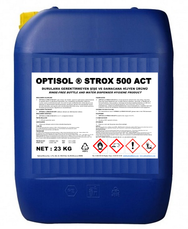 OPTISOL ® STROX 500 ACT, gıda işleme fabrikalarında, kullanma ve yıkama suyu dezenfeksiyonlarında, polikarbonat v.b. gibi şişeler de dahil olmak üzere, tüm şişe ve su damacanalarının dezenfeksiyonunda etkilidir.